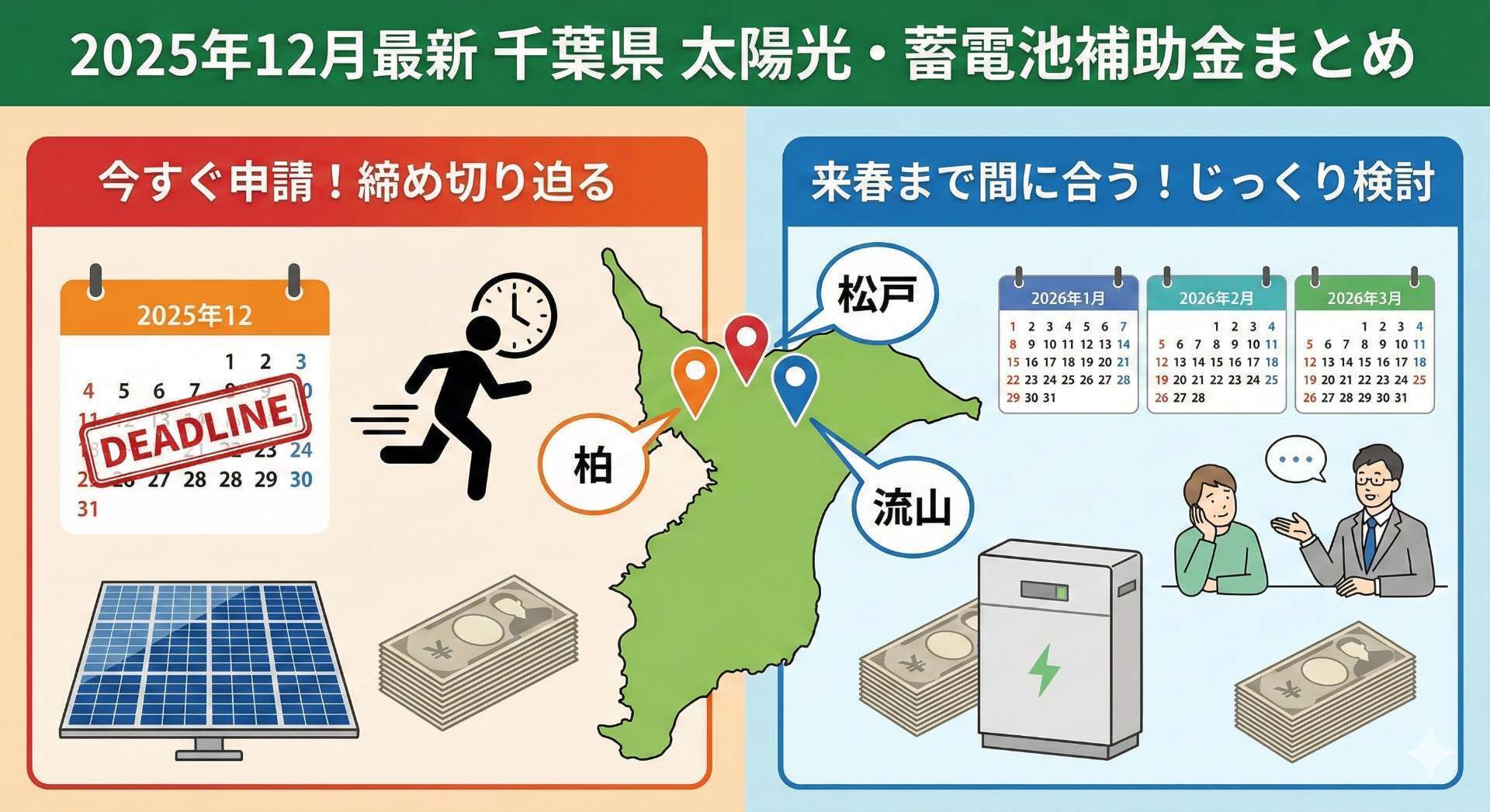 本記事では、2025年12月15日時点における、千葉県および近隣3市の太陽光・蓄電池補助金の最新スケジュールについて解説しました。
